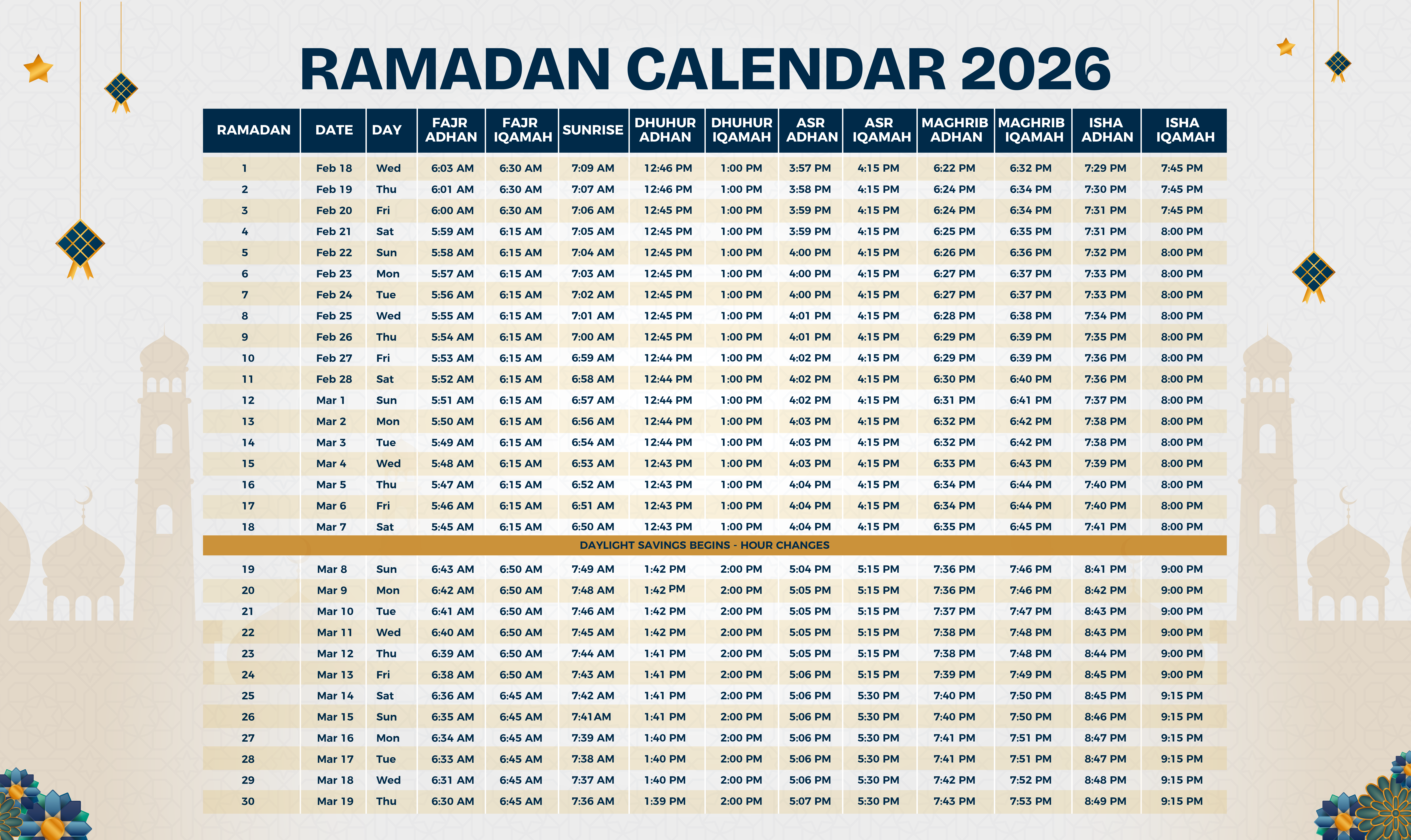 Ramadan Kareem! Here you’ll find all Ramadan-related resources from our Islamic Center, including iftar timings, upcoming events, and important policies and announcements from the administration.